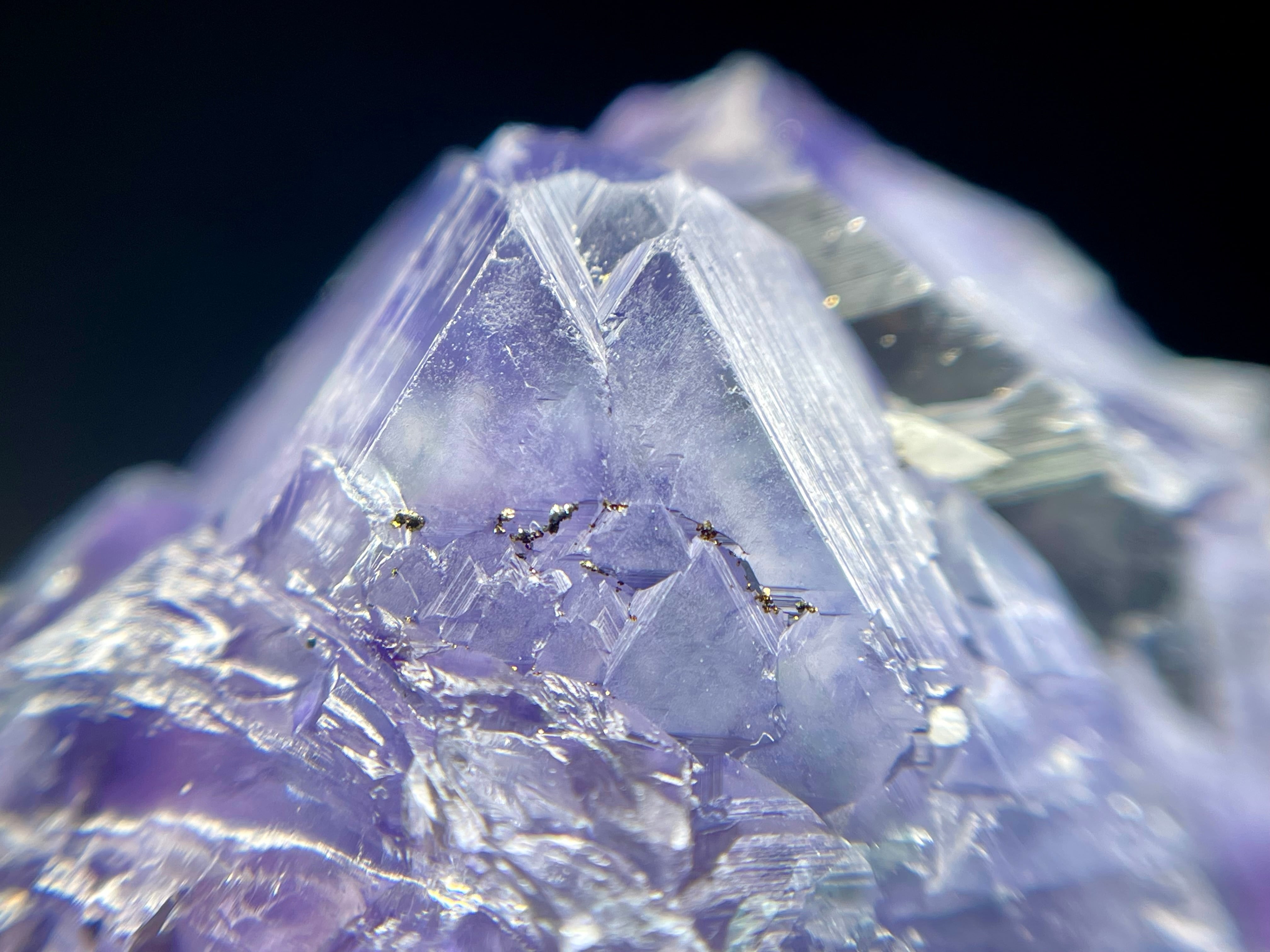 肉眼でも見えますが特に白色LEDライトを当てるとパープル、ブルー(少なめ)、グリーンのトリカラーがよりわかりやすく見えます。