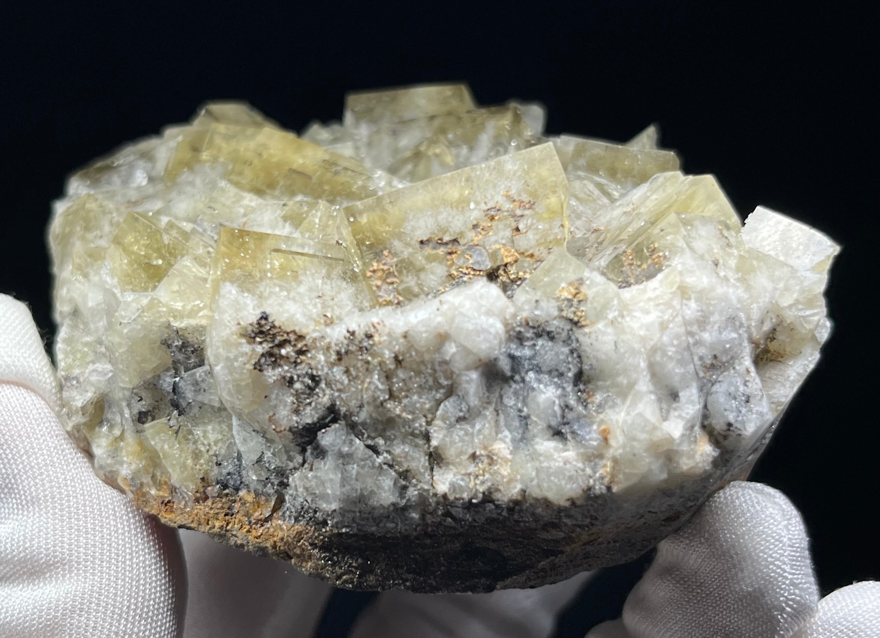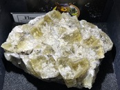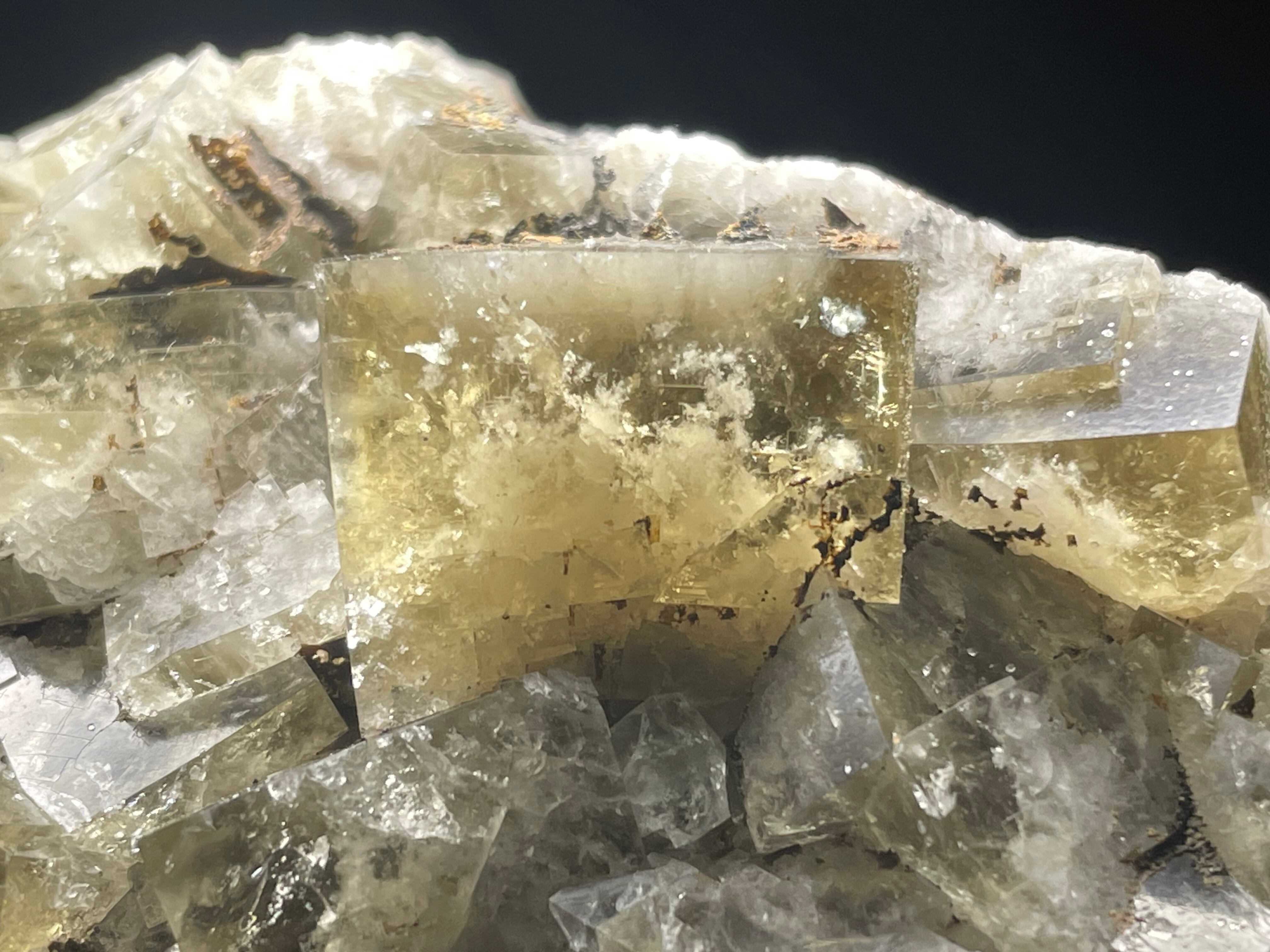 こちらの個体はThe Bull Veinフローライトのような少しダークカラーのイエローで、Poison Ivy Pocketフローライトのような白いフェザーのようなインクルージョン(4枚目)が見られます。