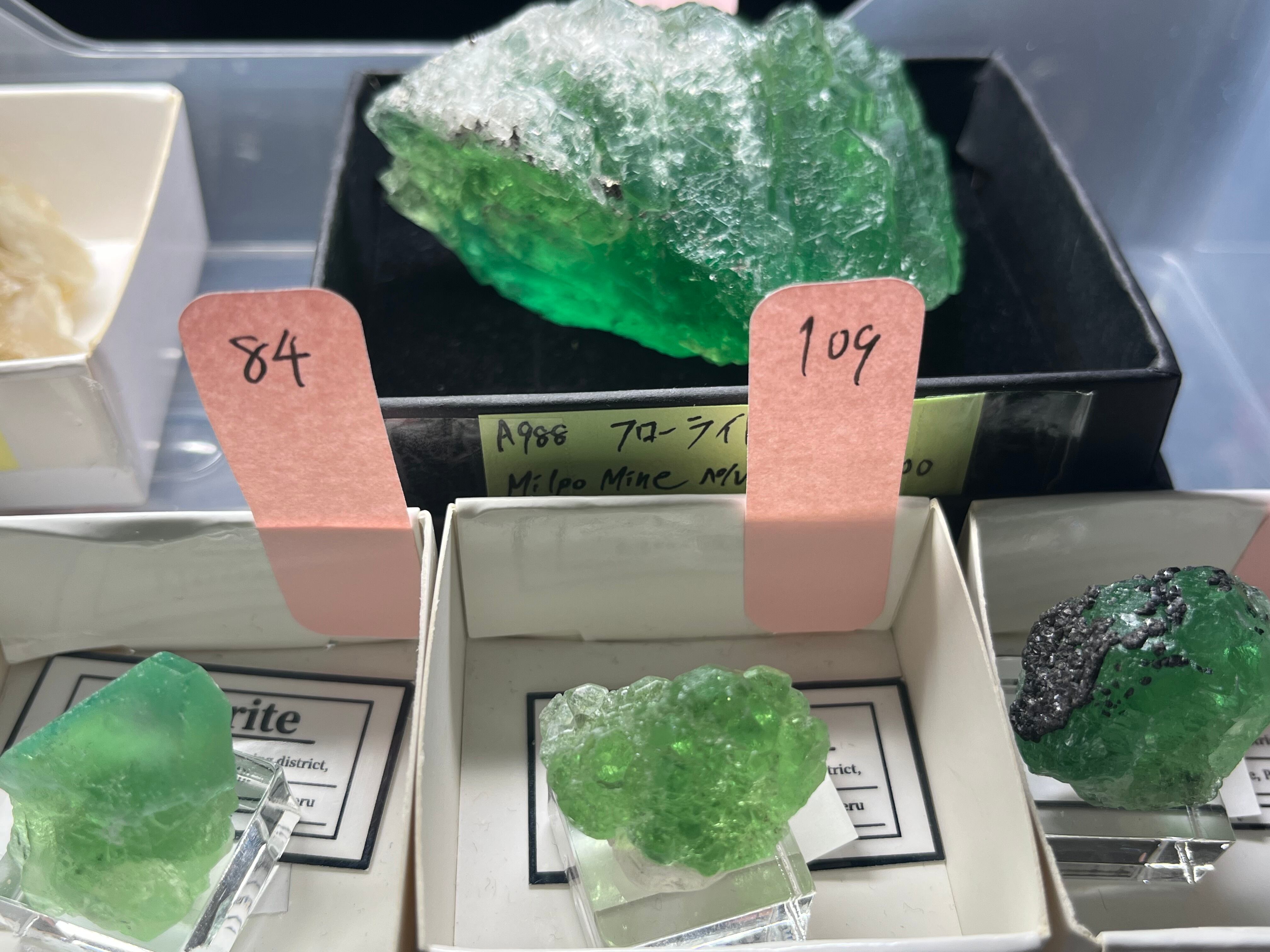 フローライト(シャンバオ産)7万8千円などなど天青石・ハイドロジンサイト・カルサイト(中国重慶市)店頭販売価格28万円・25万円