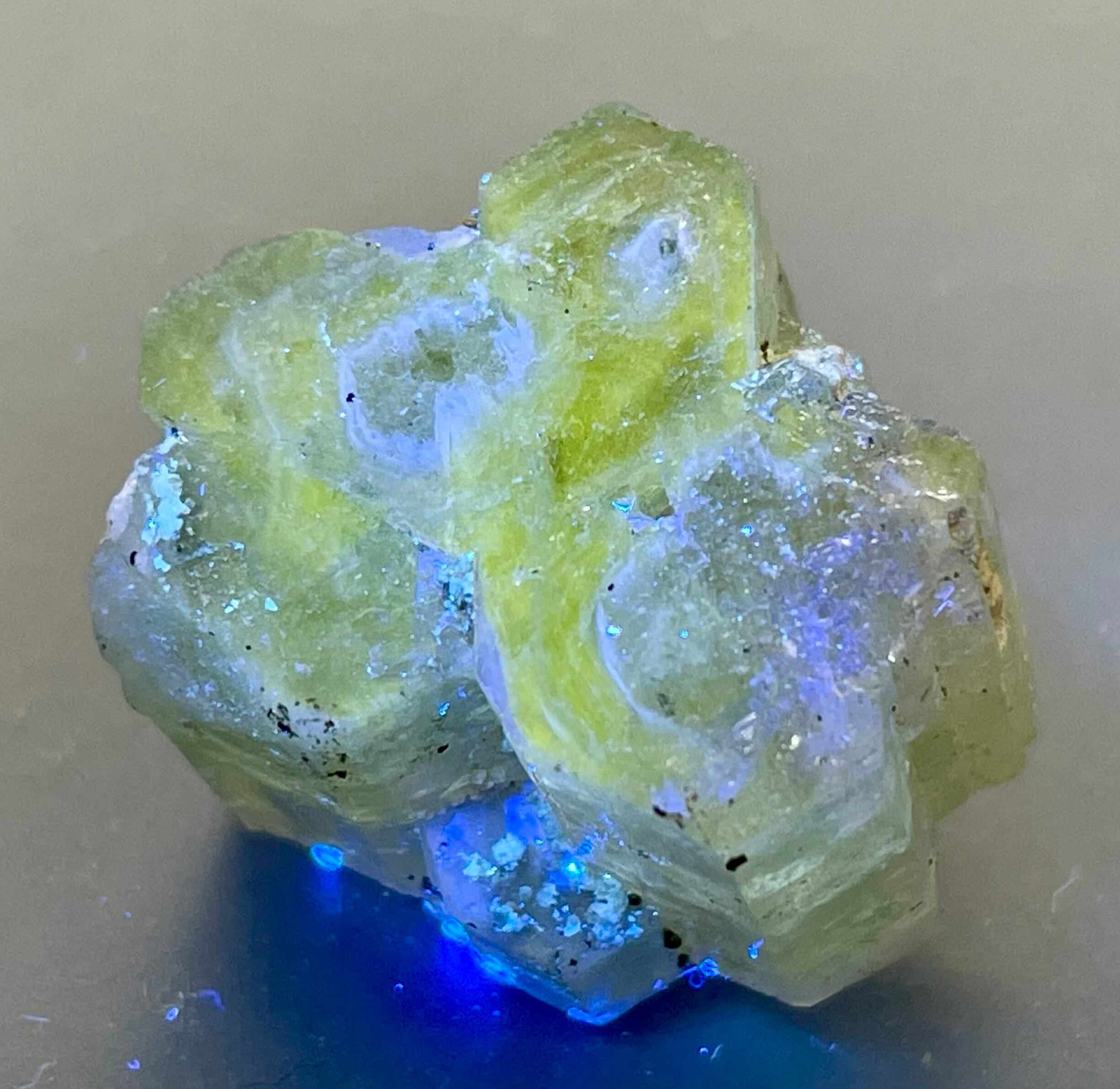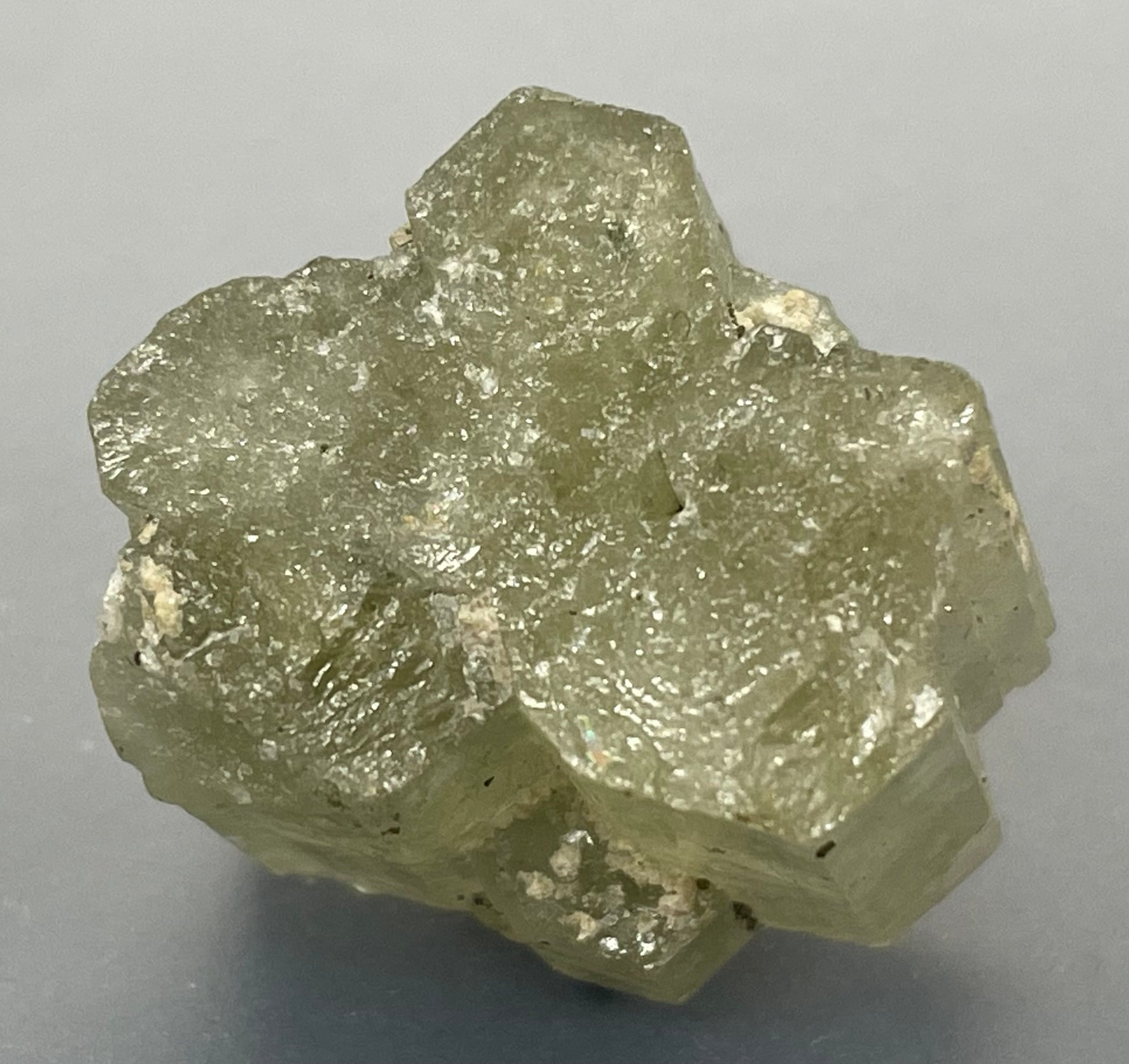 こちらは複数の結晶が集合し、まるでクリソベリルの三連双晶のような形状になっているユニークな燐灰石です。