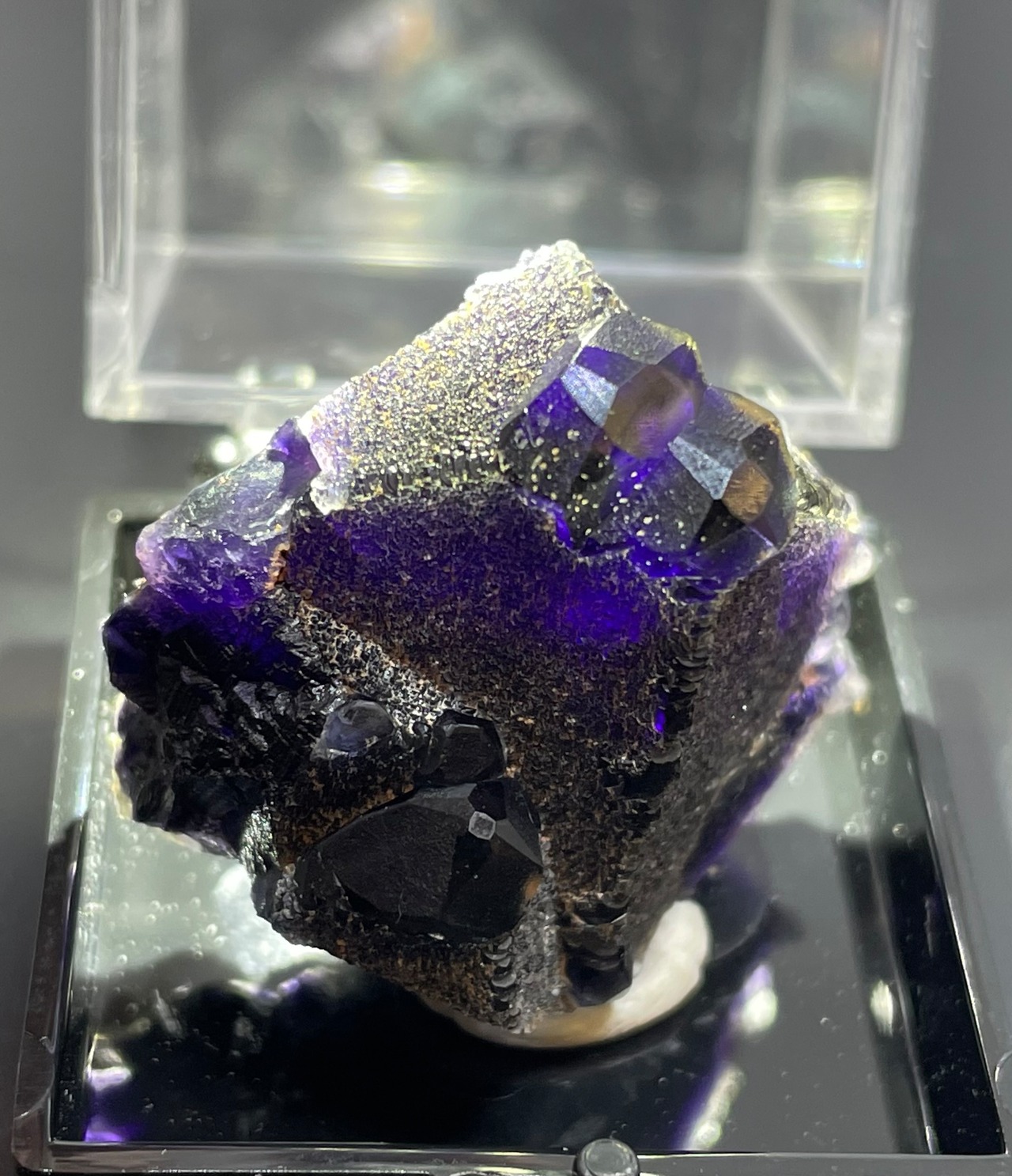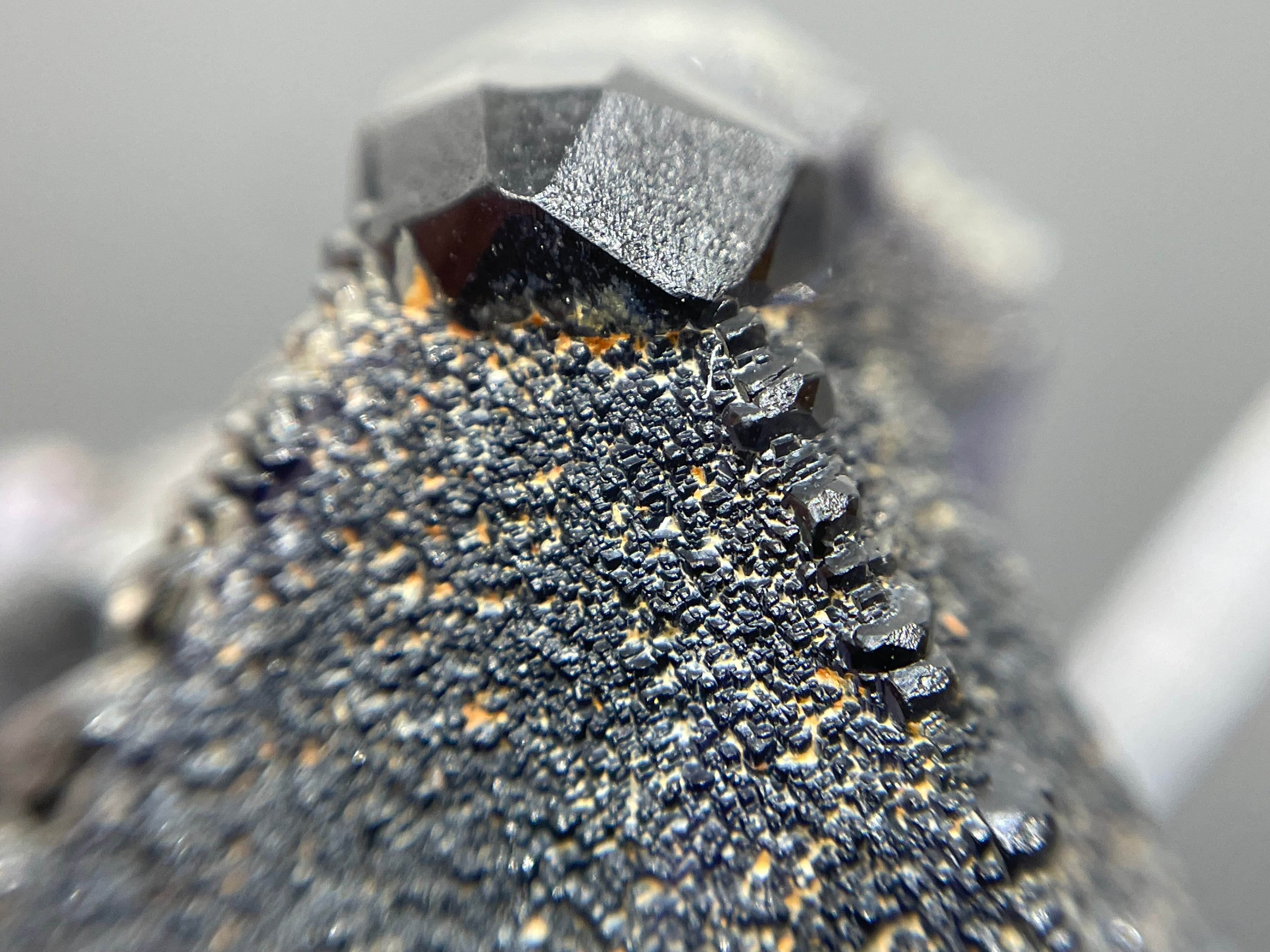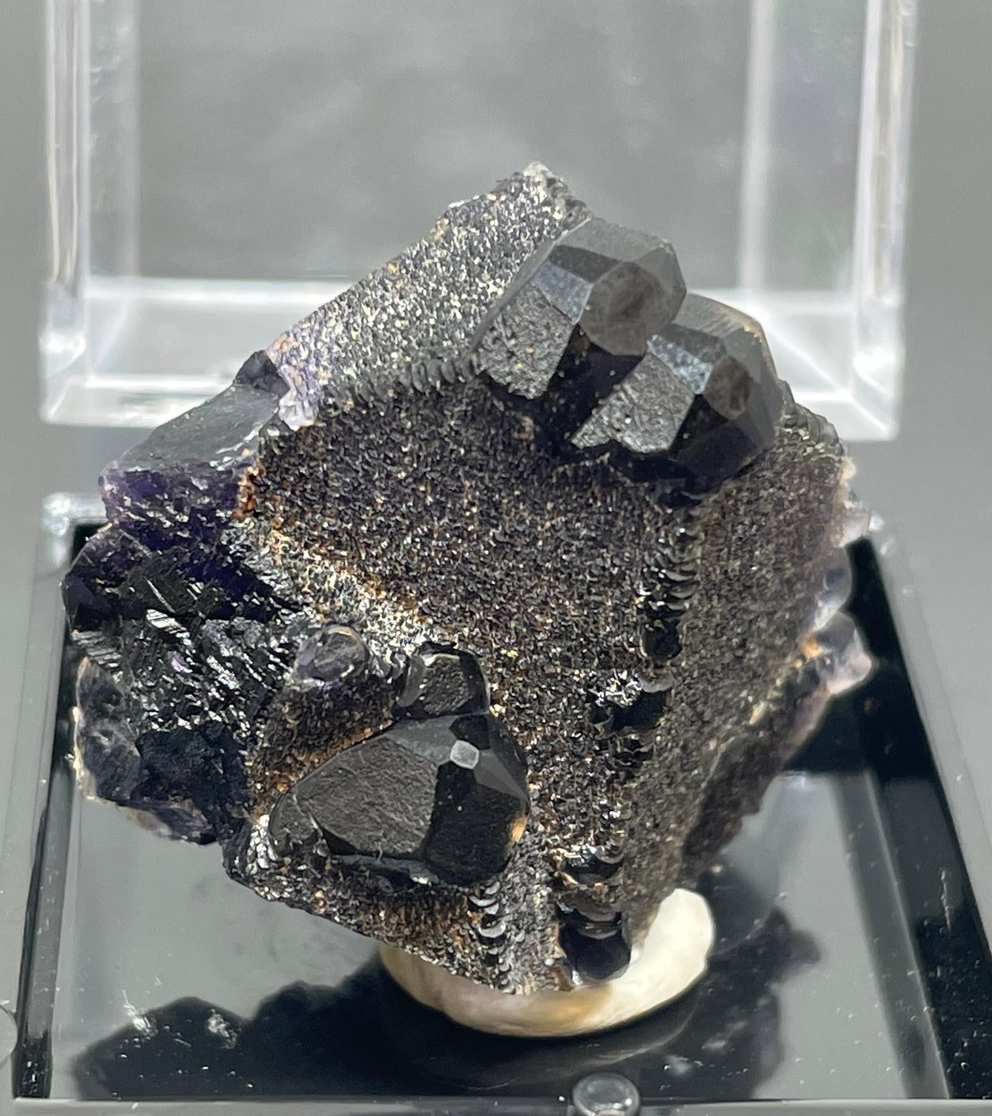 “黒竜紋“と呼んでいる独特の結晶面を持つ非常に濃いパープルの結晶が連なるユニークな個体。